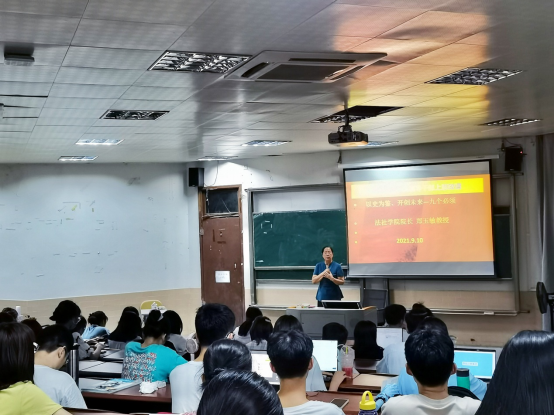 9月10日,伟德国际victor1946经理郑玉敏在莞城校区6#1为2020会计卓越1班、2020金融管理产学国际1班、2020国际商务产学国际1班、2020法学卓越1班等100多位同学上了一堂题为“奋斗百年路 启航新征程”的思政第一课,与同学们共同学习了习近平总书记在庆祝中国共产党成立100周年大会上的重要讲话精神。