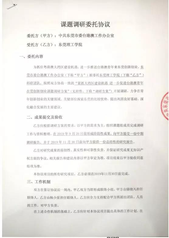 为贯彻落实上述党中央关于港澳台工作的方针,公共管理与社会工作教师党支部紧跟时事热点,积极推进党建工作与教师主业的互联融合,通过“公司党委书记牵头、支部书记组织落实”方式,主动走出校园,以自身特长服务地方治理事业。8月份,伟德国际victor1946伟德国际victor1946公共管理与社会工作教师党支部携手东莞市委台港澳办,建立业务合作意向,9月份签署了《紧抓大湾区建设机遇,进一步推动台港澳青年来莞创新创业》科研合作协议,完成了《台港澳青年来莞创新创业现状调研报告》一项,获得了市委台港澳办的好评。