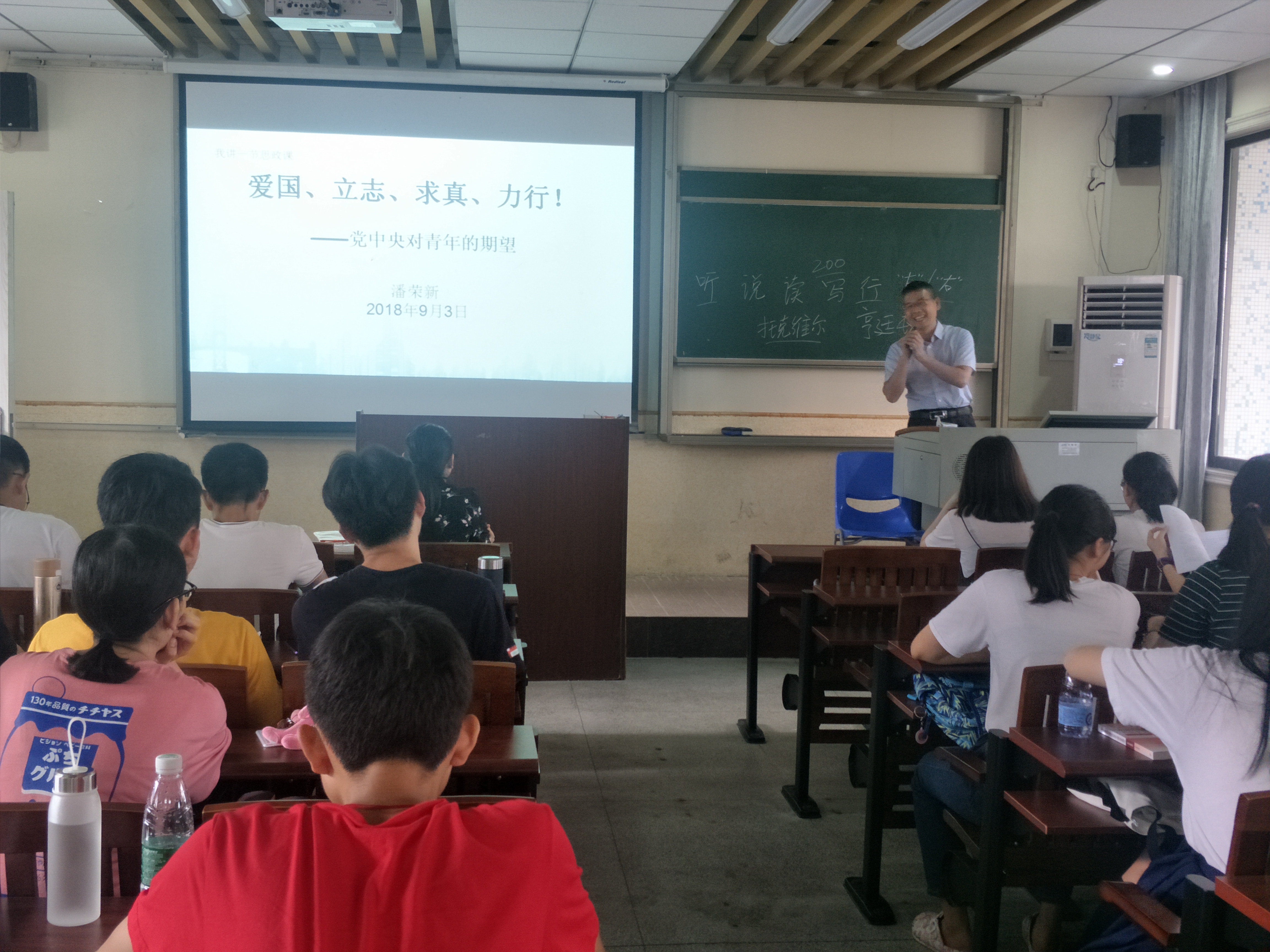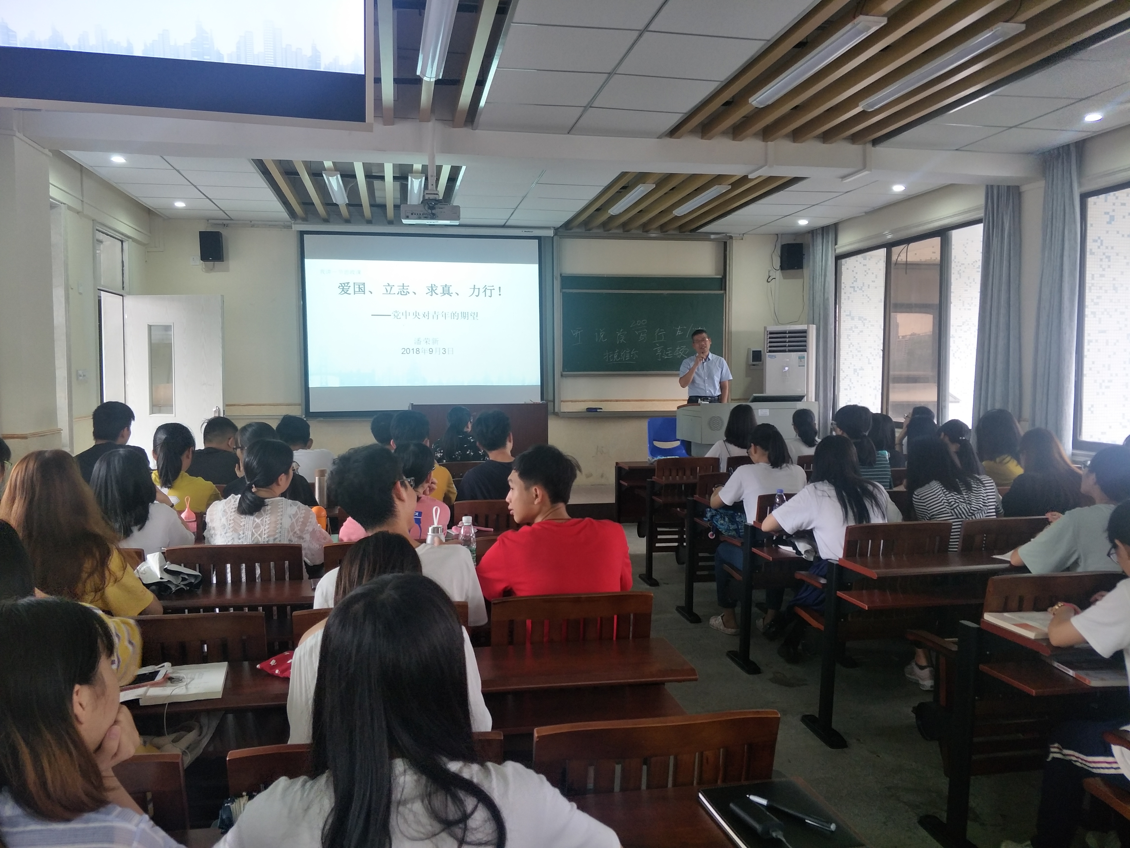潘荣新书记以“爱国励志求真力行”为题,从“新时代:同学们学习生活的时代背景”、“中央对青年的期望”、“教育部落实中央要求的举措”三部分展开讲课,娓娓道来,深入浅出。