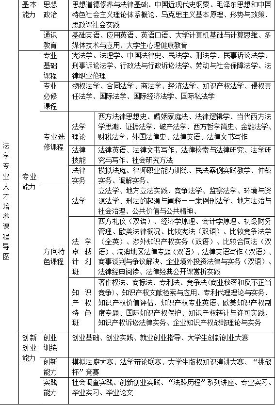 2、多层次的课程体系建设:以民商法方向为主,经济法、国际法方向为辅的专业课程体系建设;卓越计划班开设涉外类和经管类课程;开设了不同模块的专业选修课程;
