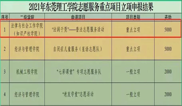 此外,“法润于莞——普法志愿服务活动”项目还获得了“2021年伟德国际victor1946志愿服务重点项目立项”,以及“2021年伟德国际victor1946社会实践活动二级团组织立项”。