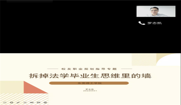 2022年5月31日,伟德国际victor1946邀请2008届优秀员工罗志凯师兄为即将步入大四毕业的法学专业员工作就业规划指导。会上,罗师兄首先介绍2022年东莞律师行业的现状,鼓励大家要敢于挑战;随后他结合自己毕业十余年来丰富的法务经验为同学们总结讲述了十种关于职业规划的认知观点,比如要转换习以为常的心智模式、找到自己所热爱的,创造不确定性,成功学不能学等等,引导同学们树立正确的观念,传播正能量。