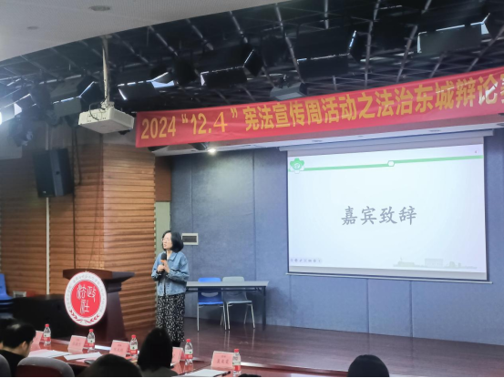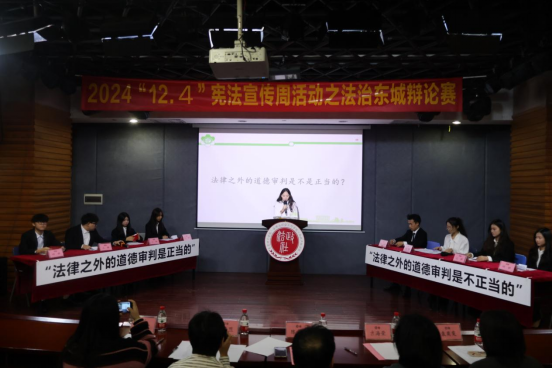此次辩论赛就“法律之外的道德审判是否正当”展开辩论。活动伊始,吉海荣老师致辞,回顾了与东莞市司法局东城分局在法治宣传和民主法治社区建设中的合作和创新,肯定了举办辩论赛对于法科员工能力和素质培养的重要意义,鼓励同学们以辩题为切入点做好学习和研究,训练逻辑思维和批判性思维,磨炼表达和论证能力,不断提升法科综合素养。
