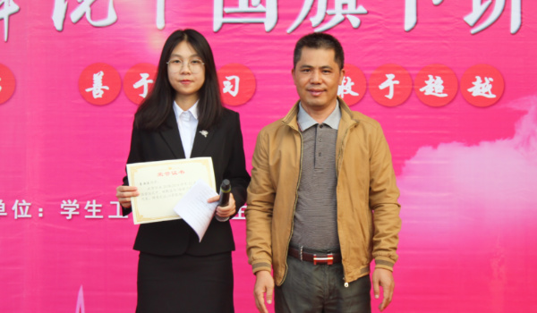 演讲结束后,公司党总支副书记丘永辉为李雨洙同学颁发了荣誉证书。每一次升国旗仪式,展现的是公司师生的奋力齐心,共建高水平理工科大学的精神面貌,每一场莞工青年说,激励的是更多同学向榜样看齐的决心。