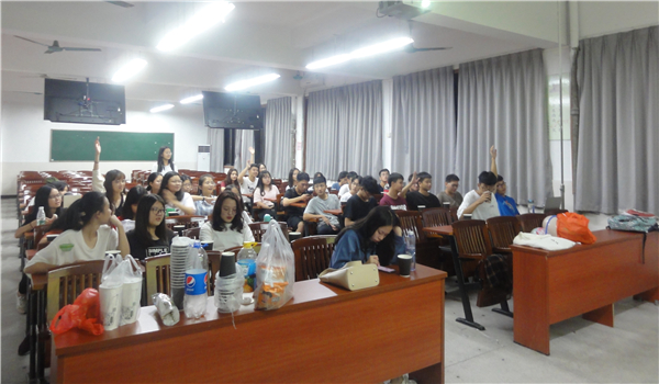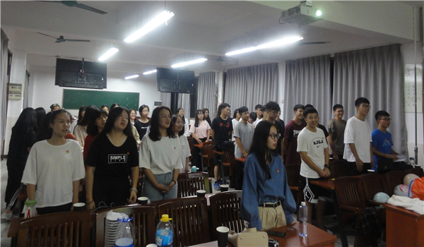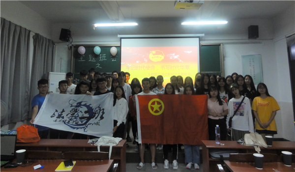 活动伊始,团支书对团日活动做了简要介绍后,由主持人万嘉如主持班会。首先是知识竞赛项目,同学们在限定时间迅速记忆团章、国歌法、国旗法相关内容,之后分组进行举手抢答。比赛场面十分热烈,每次主持人喊完抢答开始,同学们的小手齐刷刷地举起,竞相喊着“我来,我来……”最终比赛以第四小组的胜利画上句号。接着,我们的嘉宾炯纯师姐分享了一些她的学习经验和员工组织活动心得体验,同学们积极提问,师姐也耐心解答。其次便是你演我猜环节。小组选择两位成员观看工作人员播放的《西游记》、《亮剑》等正能量经典影片片段并进行演绎,其他成员负责猜影片名称。薛珊师姐和炯纯师姐也参与其中,演绎的同学声情并茂地将影片内容展示给大家,场上笑声不断。接下来进入观影时间。我们观看纪录片“厉害了,我的国”,感受祖国的飞速发展,虽然一些同学之前已经看过这部影片,但大家还是安静、认真观看。最后,我班同学合唱团歌,拍集体,第一次团日活动完美结束。