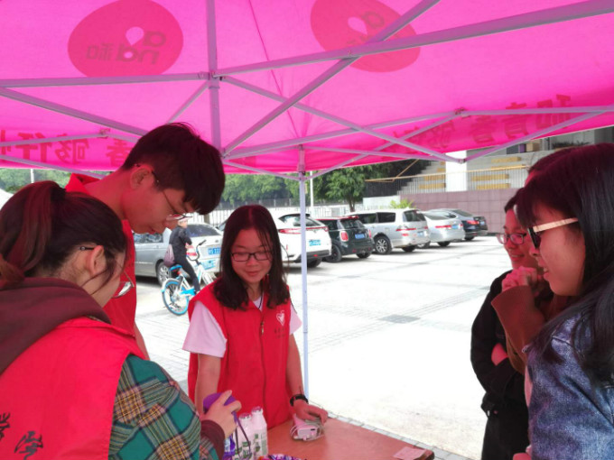 十一点三十分,志愿者们相继到场进行摊位布置;十二点,活动准时进行。本次活动由“线上传声筒”、“方言教程”、“销声匿迹”三部分组成。在摊位上,随处可见的有关“莞工法社团总支志愿服务站”微博号,吸引着过路者的关注,推进着线上传声筒活动的举行,给予了同学们听觉上的愉悦。同时方言教程和销声匿迹的活动也引来了许多参与者,活动在一片斗智斗勇和欢笑声中顺利开展起来。