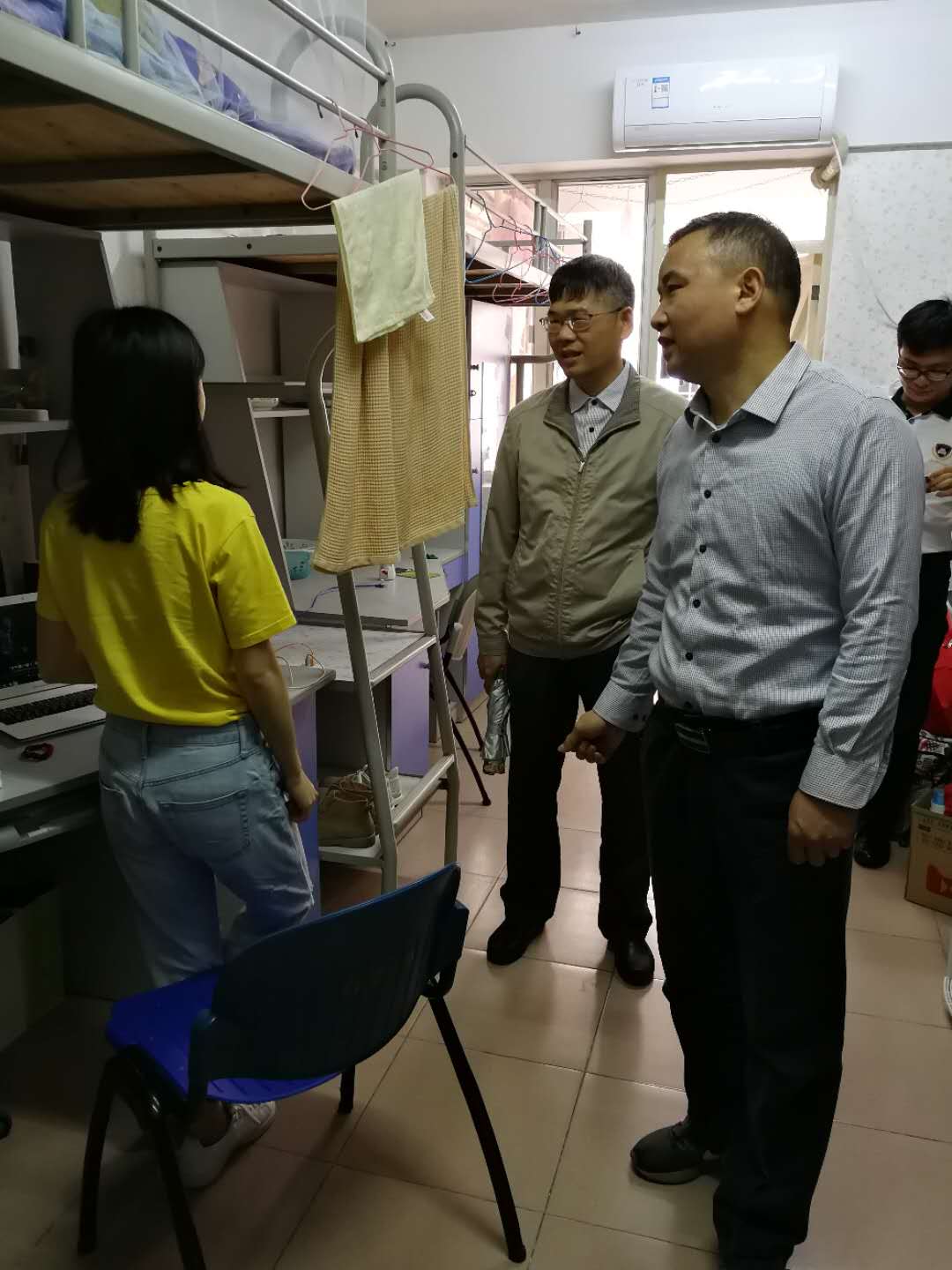 走访伊始,强昌文经理详细询问了同学们基本情况,询问宿舍的基本设施是否能够满足同学们的生活需求。同时,叮嘱同学们要注意宿舍可能存在的安全隐患,及时发现、及时报送。潘荣新书记则与同学们分享了假期的趣事,尤其是在刚刚过去的春节,了解同学们的生活、学习状态,同时也寄语同学们,新学期已经开始了,要收收心,结束假期的舒适状态,以饱满的精神状态迎接新学期的学习。走访最后,辅导员老师们也希望同学们能够的尽快调整状态,对新学期学习和生活做到早规划,勤行动,多坚持,才能实现完成自己的既定目标。