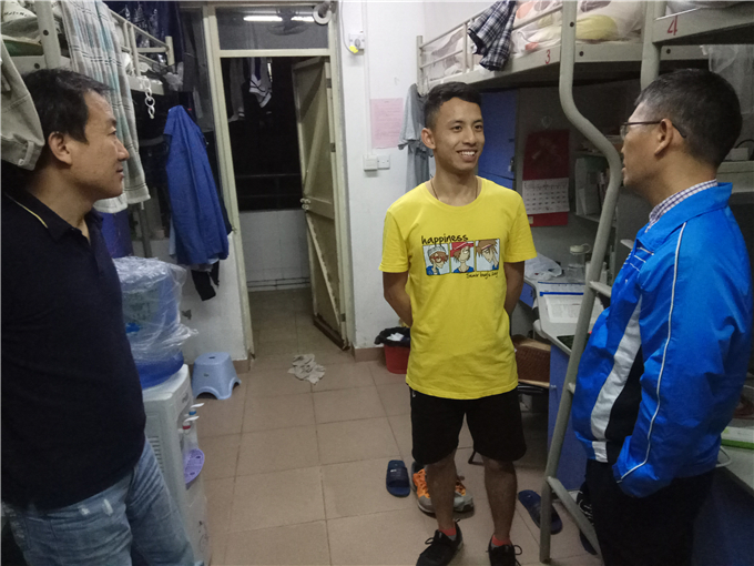 10月30日晚,伟德国际victor1946潘荣新书记与辅导员老师一起走访员工宿舍,检查安全隐患。