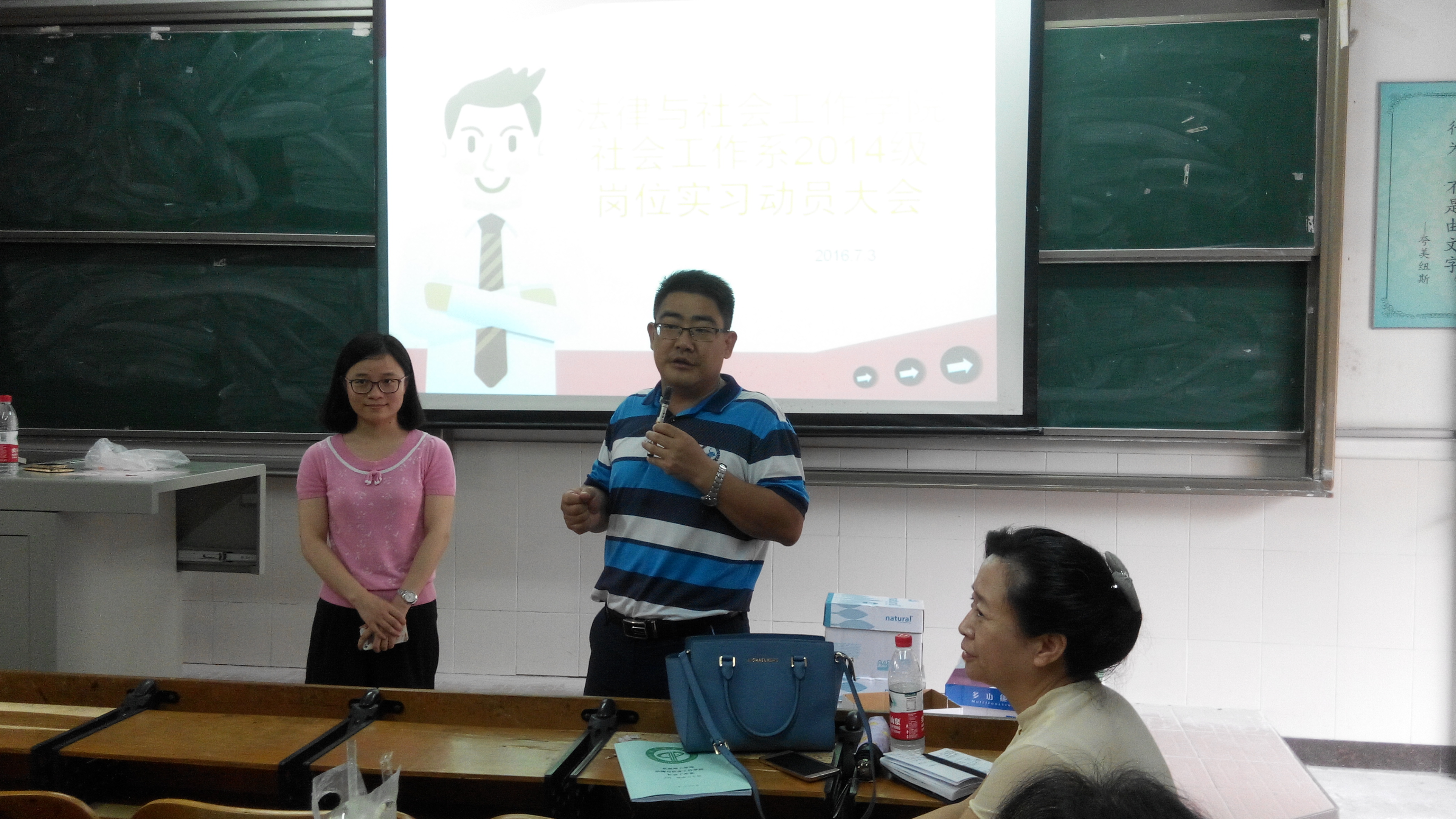 为进一步做好社会工作系2014级员工岗位实习工作,让员工明确岗位实习的意义,引导员工做好岗位实习的心理准备,7月3日下午3点,社会工作系在莞城校区1308课室召开2014级岗位实习动员大会。公司副经理夏能礼、系主任成伟教授,专任教师张雪,香港中文大学社会工作系博士后夏丽丽出席了此次大会。