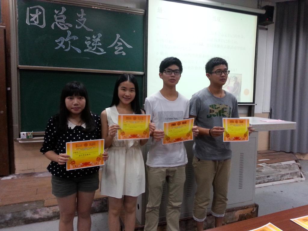 欢送会在轻松、愉悦的氛围中开始。每个部门都进行了有趣幽默的部门展示。而在部门展示中间还穿插了不同的游戏环节,干事们都玩得十分开心,炒热了气氛。接下来,我们进行了一年一度的“每年之星”颁奖,给每个书记和每位部长及副部长颁奖各个部门的干事分别给自己的部长宣读了颁奖词,表达了自己对部门和每个同伴的感谢之情。各个书记和部长总结了这一年的工作,分享了一些自己的看法和建议。第一副书记叶灏彬师兄分享了自己的工作经历,鼓励干事们积极参加员工工作,同时对团总支表达了自己的不舍,希望团总支能越做越好。最后,欢送会在团总支全体成员齐唱《最美的太阳》中落下帷幕,大家来合影来铭记这一个难忘的时刻。