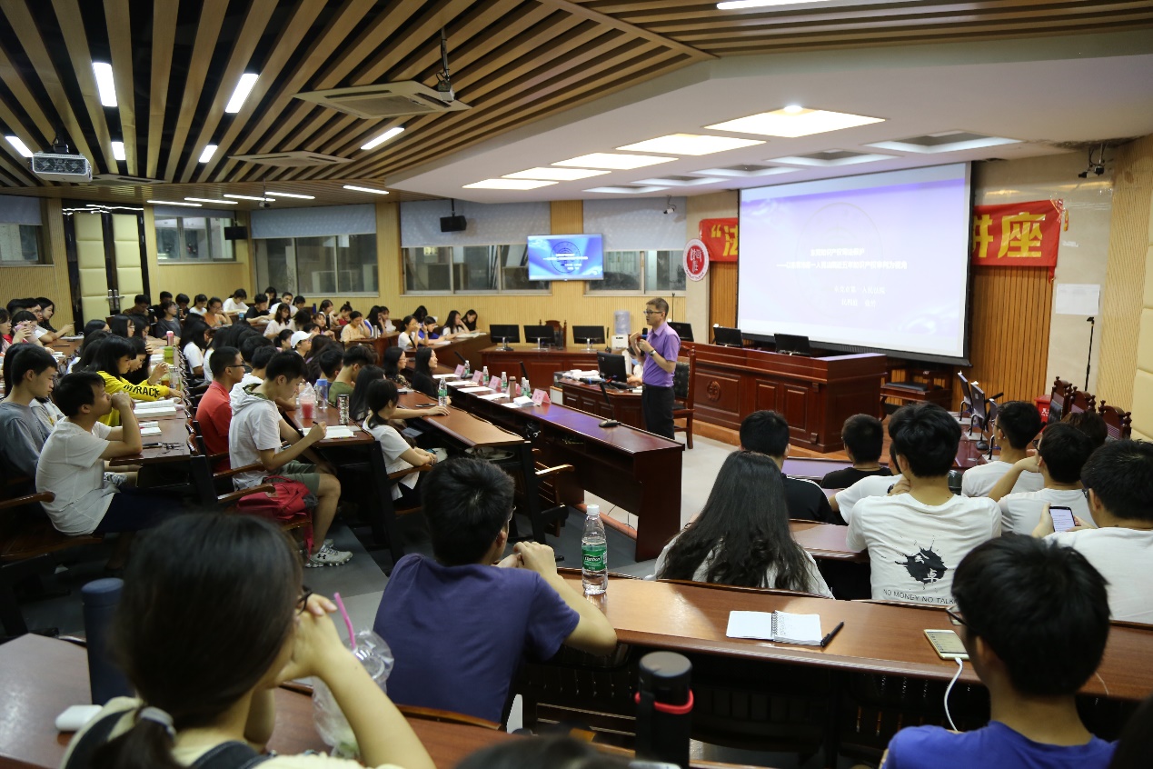 讲座伊始,张竹副庭长向同学们展示了近五年来知识产权案件的审判概况,并向大家讲解了知识产权审判的概念以及不同等级法院负责管辖的各类案件。他说到,近五年来知识产权案件的结案情况变化跟“东莞制造”到“东莞智造”的转型有关。紧接着,他向同学们介绍了知识产权纠纷的七大特征,包括侵权对象日益多元化、诉讼主体类型复杂、利用信息网络侵权、商业维权和批量维权比例较大、权利冲突类案件增多、地域相对集中等。然后介绍了在知识产权审判过程中可能遇到的问题,包括未能设立知识产权审判专门机构、刑事案件补充侦查比例高、查扣物品处理难度大、市场主体知识产权意识淡薄、诉讼能力较弱、知识产权运用的市场配套机制不健全以及监督力度不足等。张副庭长指出,解决此类问题应从以下方面进行整改,不仅要继续加大知识产权保护力度、激励社会创造创新,而且应加强政府治理服务、推动净化知识产权市场环境。此外,还应建立健全知识产权市场配套机制,发挥行业自律优势,加强知识产权法治宣传以及培育尊重知识产权风气。