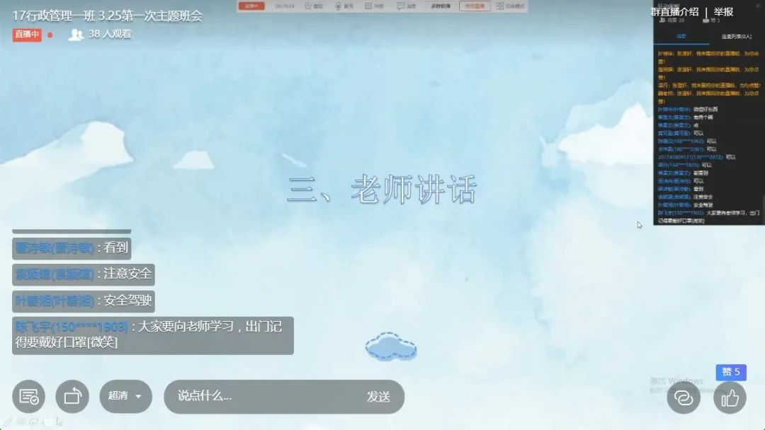 班主任魏红征老师也带着叮嘱参与到其中来,结合当下,给同学们提出了对于疫情期间所发生事情的一些思考。希望同学们多关注时政新闻,多思考,多学习,多读书充实自己。要看到疫情之中社会发展的变化,比如线上的网课带来的冲击,互联网发展的趋势,在疫情期间我们能认知和学习到平时不注意或学不到的东西。作为一位行政管理专业的员工,要时刻具有公共精神和公共意识,用公共管理的视角看待问题,提出自己的观点,并且能够条理清晰分明的解释。最后,老师也向同学们提出了一些期望和关于疫情防控的注意事项。