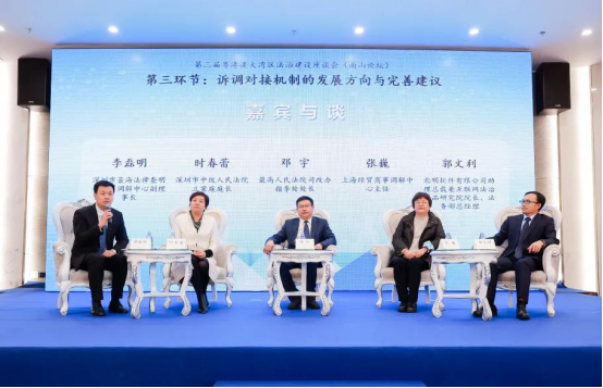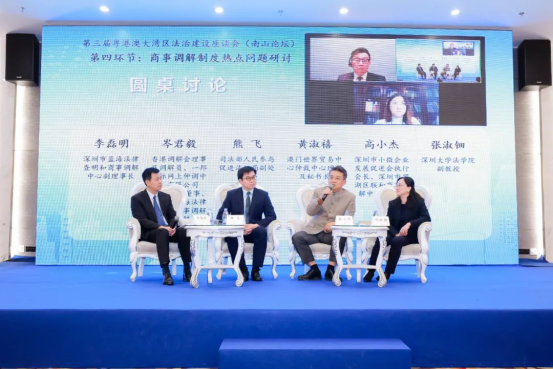 深圳市中级人民法院立案庭庭长时春蕾,香港国际仲裁中心理事暨香港调解会理事、一邦国际网上仲调中心有限公司(eBRAM)董事会成员、蓝海中心调解员岑君毅,澳门世界贸易中心仲裁中心秘书长黄淑禧,上海经贸商事调解中心主任张巍,深圳大学法公司副教授张淑钿,深圳市小微企业发展促进会会长、深圳市罗湖区联和商事调解中心理事长高小杰,北明软件有限公司助理总裁兼互联网法治产品研究院经理、法务部总经理郭文利等嘉宾参与圆桌讨论。