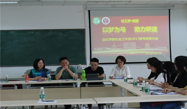 本次会议出席的老师有社会工作系系主任成伟老师、副系主任张雪老师、副系主任王海洋老师、社会工作系居正老师、李霖老师,并且我们还邀请到了社会工作系的第一届学姐,现在公司的辅导员刘欣颖老师,她曾两次赴战考研,并且成功考取中山大学硕士。