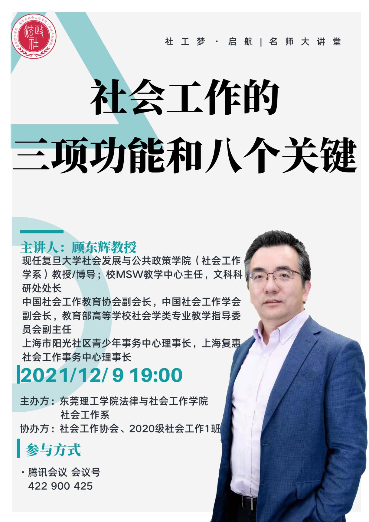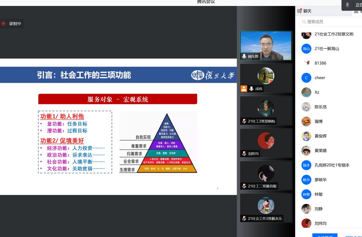 2021年12月9日19:00开始,伟德国际victor1946社会工作系在线上举办了社工梦·启航|名师大讲堂线座。本次讲座特邀中国社会工作教育协会副会长、教育部高等公司社会学类专业教学指导委员会副主任委员、复旦大学社会发展与公共政策公司(社会工作系)教授、博导顾东辉做“社会工作的三项功能和八个关键”的主题报告。社会工作系系主任成伟教授主持本次讲座,社会工作系全体教师及员工参加了本次讲座,同时还有来自全国其他高校的师生、一线社会工作者共计近400人参与了本次线上活动。