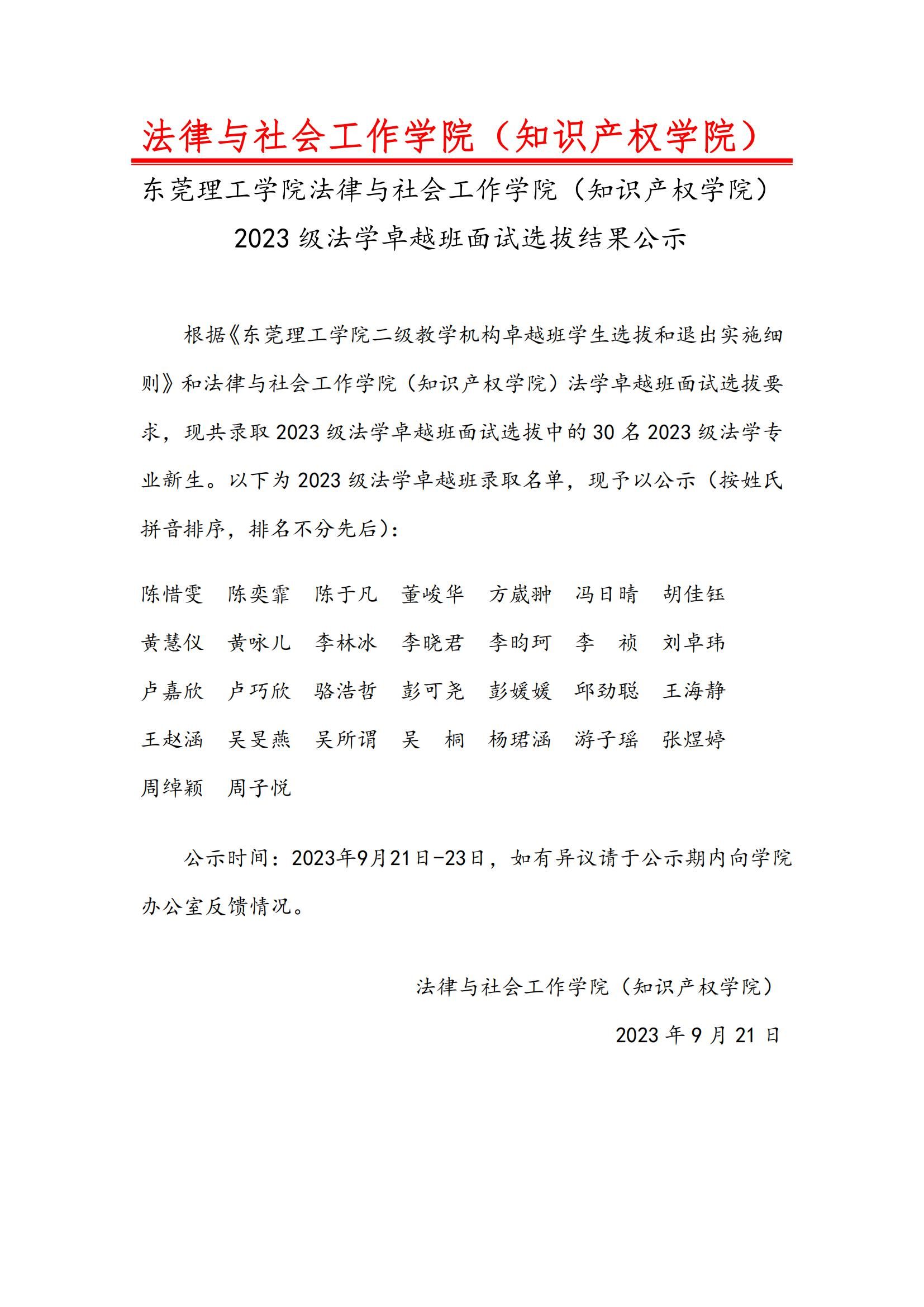 伟德国际victor19462023 级法学卓越班面试选拔结果公示