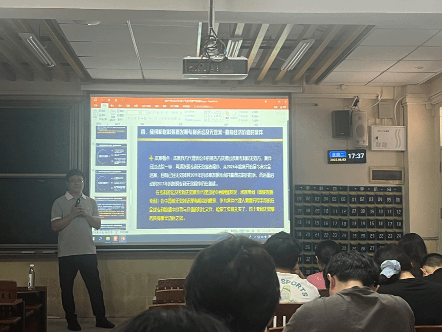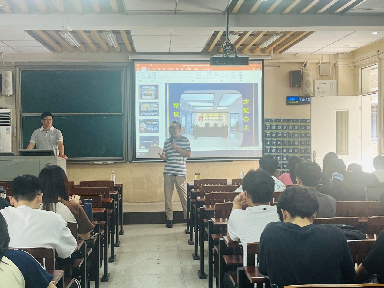 2025年6月3日,广东合方知识产权代理有限公司的涂国山总经理与潘文建副总经理作为主讲嘉宾,为2022级知识产权专业的大三员工们带来了一场务实且富有指导意义的就业指导课。东莞市知识产权保护协会的秘书长商真真女士以及知识产权系主任张建超老师也到场参加,一起为同学们的职业发展出谋划策。