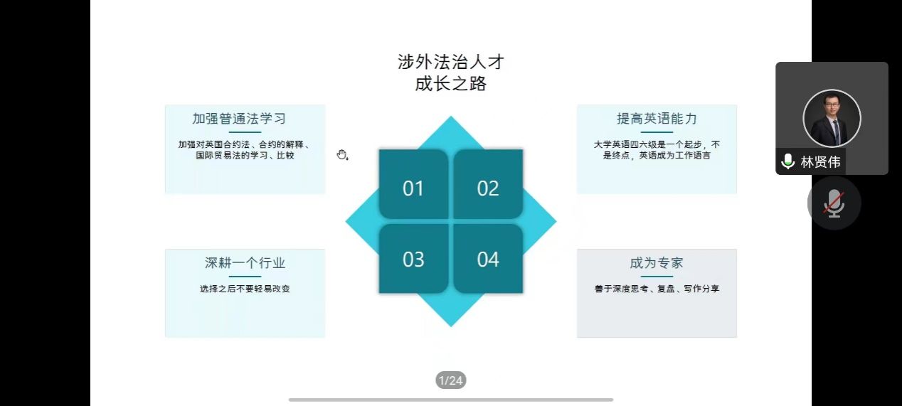 最后,林律师提出了涉外法治人才的成长的具体路径。首先,要以习近平法治思想为指导,加强对普通法、英国合同法、相关合约的解释规则和国际贸易法的学习、比较;其次,要提高英语能力,除了完成本科的四六级考试之外,也要去争取完成雅思和托福的考试。再者,他提出要深耕一个行业,不能轻易放弃。最后,他认为每个人都要善于深度思考、复盘、写作分享等内容。