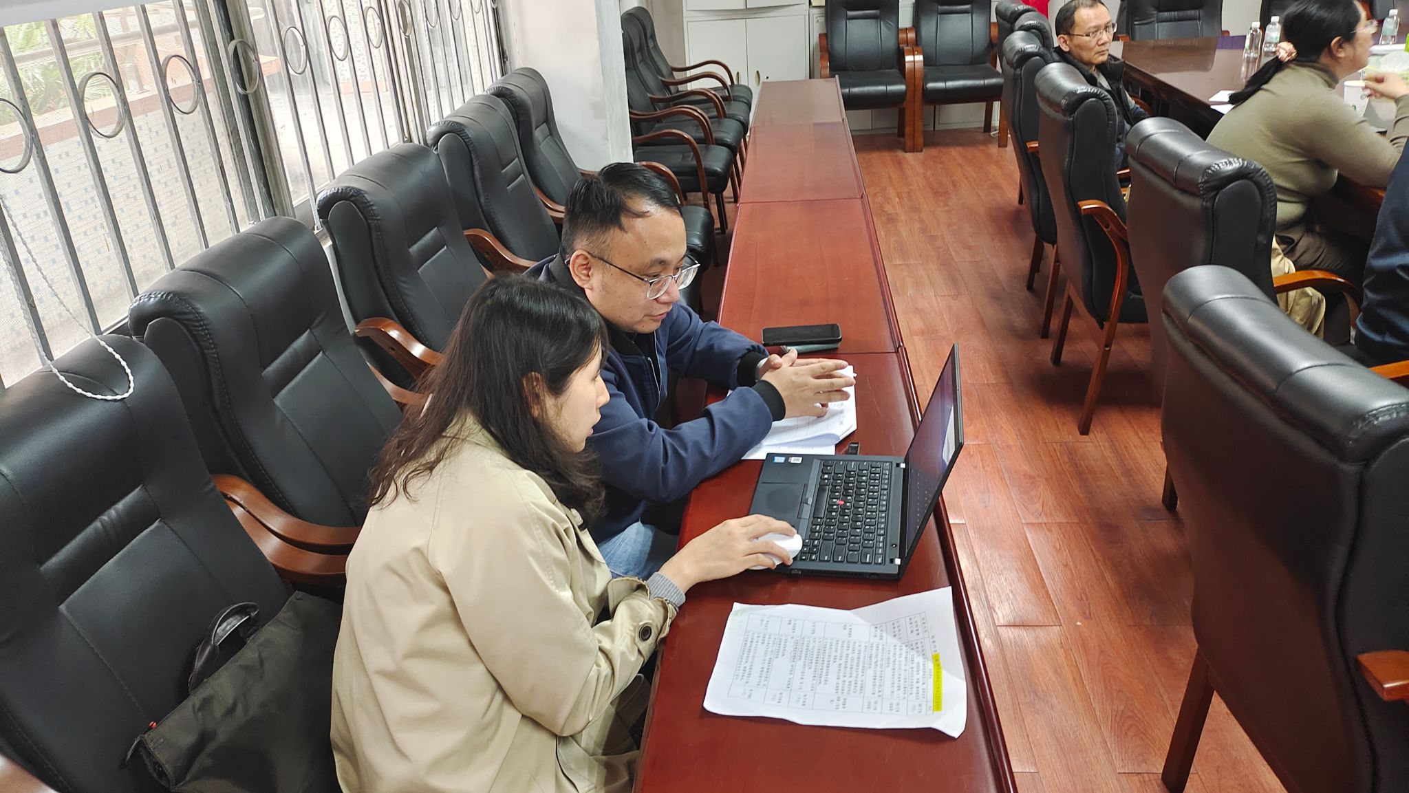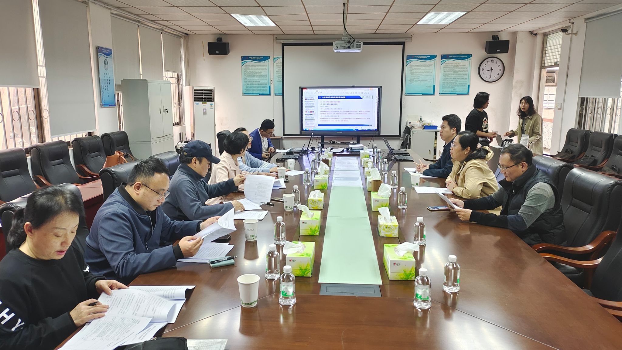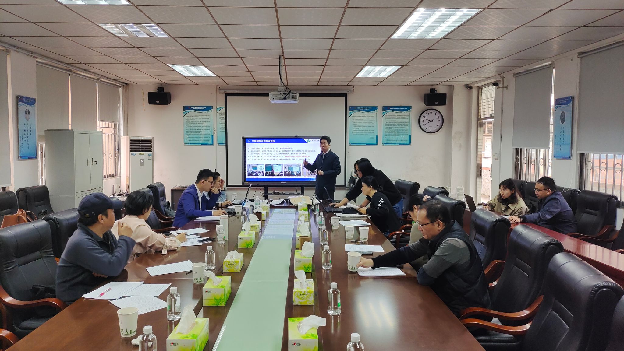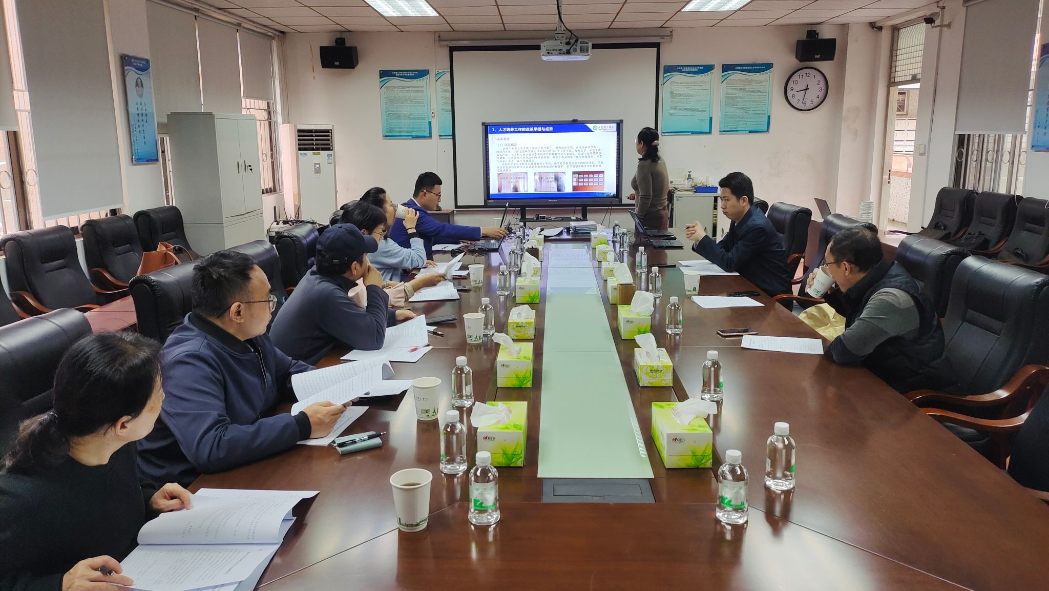 许燕转副部长和教学督导杨继学肯定了公司关于本科公司产品审核评估的准备工作,结合材料检查情况指出进一步的改进方向,并提供相应的参考措施。