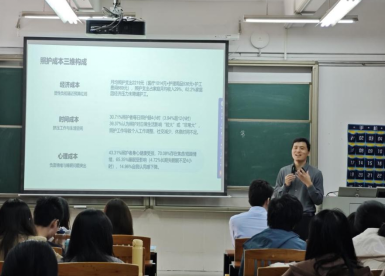 活动开始前,黄俊辉老师向在场同学介绍了模拟路演的评委以及评分规则。随后,六个小组依次登台进行调研报告展示。各小组结合调研成果,分别从多个角度阐述失能老人照顾成本以及相关问题评委对每个小组的表现进行了点评。