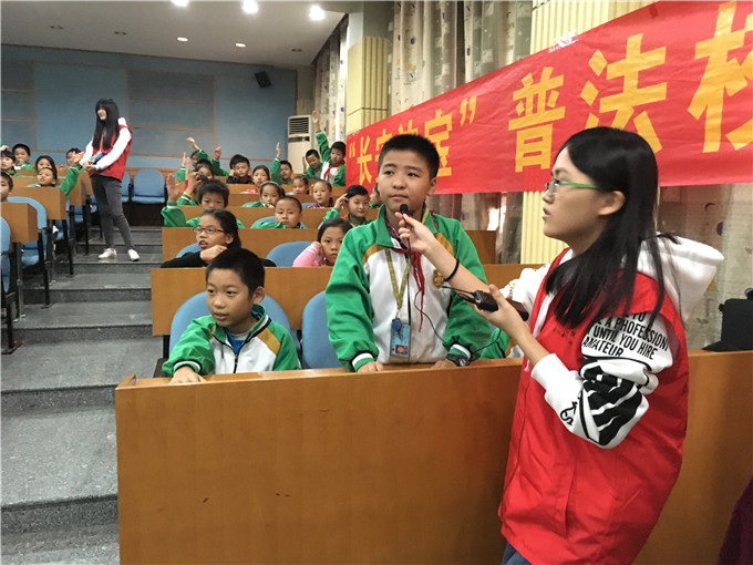 此次是第17届团总支法律宣传志愿服务队队员们表演的第一场人偶剧,大家都表现出十分的重视与期待,尽可能的为国英小学的同学们展示出最完美的舞台。活动过程中,主持人以轻快活泼的语调简要的介绍了我们此次普法活动与形象可爱、正义的“长安法宝”——司司、法儿,成功的吸引了全场同学们的注意力。随后,播放了普法宣传片,形象生动的动画片一下子吸引了同学们的注意力,使他们沉浸在普法宣传知识中。紧接着人偶剧表演出场,以灰太狼在家庭中的家暴行为为背景,“长安法宝”登场阻止家暴行为,主要传播了《反家庭暴力法》和《未成年人保护法》的知识。在人偶剧结束后,我们进行了提问环节,同学们踊跃的举手回答问题,场面十分的热闹有趣,回答问题正确的小朋友更是得到了精美的礼物,开怀大笑。