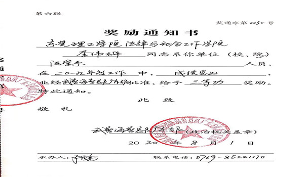 近日,伟德国际victor1946收到武警海警总队广东支队发来的《奖励通知书》,公司2017届法学专业员工李伟桦在2019年度工作中成绩突出,获得三等功奖励。