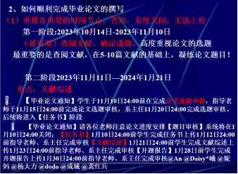 其次,龚老师特别指出2024届所有毕业生的毕业设计(论文)的相关工作即,指导老师提交选题、员工选题、开题报告、论文写作、查重检测、评分管理等事项,均需在伟德国际victor1946老员工毕业设计(论文)管理系统中完成,所以,龚老师特别要求同学们高度重视各各个毕业论文撰写工作中的重要的时间节点,否则,系统关闭,无法上传。此外,龚老师还特别强调了同学们认真做好毕业论文撰写过程中的指导记录,指出同学们的毕业论文指导记录从10月14日开设,每周做好两次指导记录。