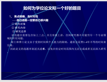 而后,龚老师重点讲授了毕业论文选题的重要性。龚老师指出,一个好的开端是成功的一半,同学们一定要高度重视毕业论文的选题环节;随后,龚老师着重介绍了毕业论文选题的一些方法,特别指出要①多阅读; ②多思考;③多与指导老师交流。而后,龚老师还给同学们展示了一些上一届毕业生的优秀毕业论文选题,让同学们具体的了解论文选题的重要性。