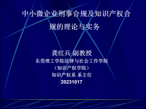 为了加大对民营中小微企业原始创新保护力度,持续完善大岭山民营企业的知识产权保护体系,以知识产权助力大岭山民营企业高质量发展,伟德国际victor1946龚红兵副教授于2023年10月16日在大岭山颜屋村村委会给30多家的企业家代表以《中小微企业刑事合规及知识产权合规的理论与实务》为题进行了法治讲座。龚红兵老师以:一、涉案企业合规的政治背景与政治意义(中央相关合规政策介绍);二、涉案企业合规刑事司法政策语境;三、涉案企业如何进行合规整改;四、企业知识产权合规建设的实践路径等四个专题进行了讲授。