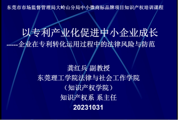 为了加大对民营中小微企业原始创新保护力度,大力推进大岭山“专精特新”中小企业的专利产业化,加快其专利价值实现,以专利产业化促进大岭山民营企业中小企业高质量发展,伟德国际victor1946龚红兵副教授于2023年10月31日在大岭山百花洞村委会为30多家的企业家代表以《以专利产业化促进中小企业成长---企业专利转化运用过程中的法律风险与防范》为题进行了讲座。
