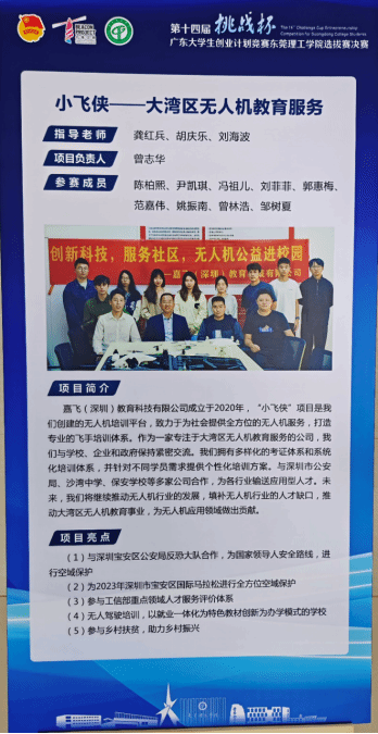 由公司龚红兵、胡庆乐、刘海波老师指导的项目“小飞侠——大湾区无人机教育服务”成功入围了本次决赛,并以校排名第五的佳绩成功入围“挑战杯”省赛。