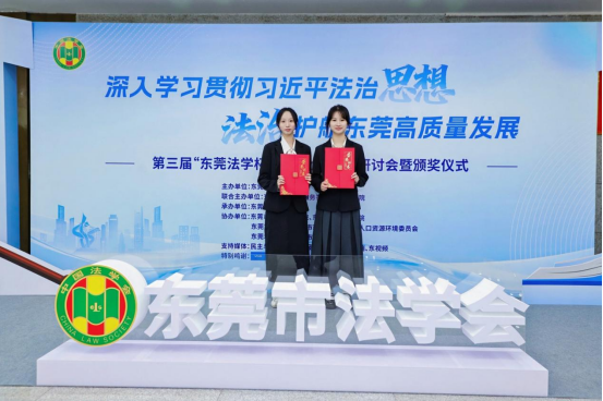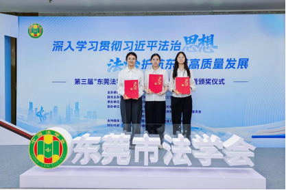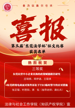 公司共有两篇获奖文章,分别是由庄瑞银 郑伊涵 王筱琪等老师和同学共同撰写的文章:《东莞民营中小企业出海的政策赋能路径研究》和龚红兵副教授指导的,由张芷瑄 时思阳 蒋钰、陈郑南凝等24级知识产权专业同学共同撰写的文章:《东莞跨境电商面对海外诉讼下TRO临时禁令的应对措施》。