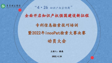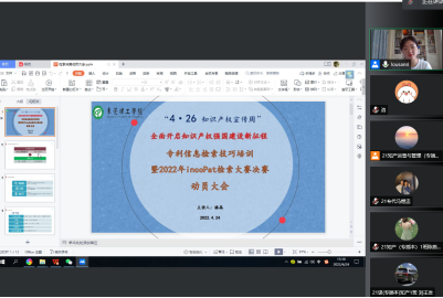 4月20 - 26日为全国知识产权宣传周,今年主题为“全面开启知识产权强国建设新征程”。为了提升公司师生知识产权保护意识,营造尊重知识产权良好氛围,积极推进知识产权强校建设,公司于2022年4月24日下午,通过腾讯会议举办了4.26知识产权宣传周暨2022年incoPat高校检索大赛决赛动员大会,出席会议的伟德国际victor1946经理郑玉敏、知识产权系主任龚红兵、专业老师楼晶以及进入incoPat决赛的各位同学。本次会议由龚红兵主任主持,楼晶老师主讲。