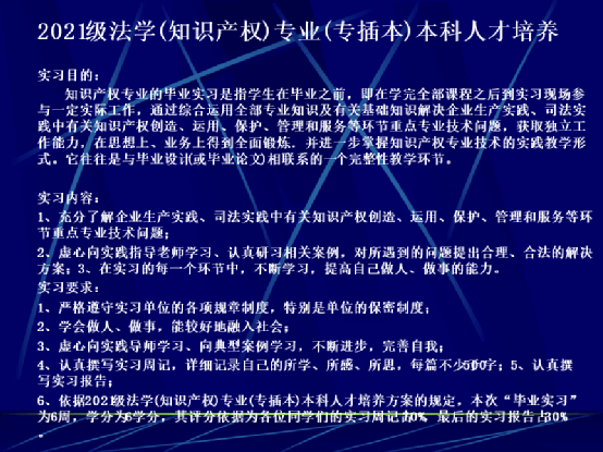 在动员大会上,龚主任分别从《9级法学(知识产权)专业本科人才培养方案》和《2021级法学(知识产权)专业(专插本)本科人才培养方案》中对专业实习要求入手,强调了本次专业实习的目的、实习内容和实习要求。此外,龚红兵老师还对同学们在实习中的安全问题和纪律要求进行详细阐述,要求同学们认真履行实习职责,以踏实的作风和严肃的态度虚心学习,进一步提高自身专业技能,遵守纪律,与单位领导同事们友好相处。希望同学们在实习过程中坚持学习、克服困难,秉持公司学子勤奋好学、吃苦耐劳、独立自强的优良作风