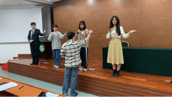 邓磊老师在指导员工进行演讲手势语言的训练